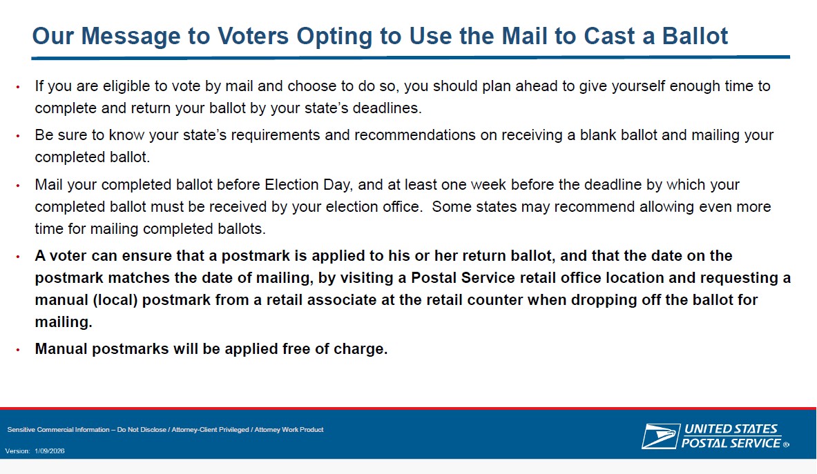 Below is an update from the United States Postal Service regarding postage in relation to Absentee Voting By Mail:
